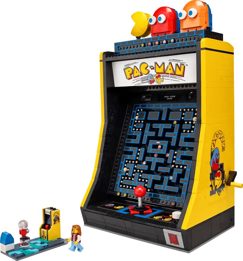 Ten model LEGO zawiera liczne detale w stylu vintage oraz zabawne funkcje, takie jak czterokierunkowy joystick i podświetlany otwór na monety. Obróć uchwyt, aby uruchomić mechaniczny labirynt symulujący klasyczny pościg między postaciami, lub otwórz tylny panel, by zobaczyć mechanizmy wewnętrzne. Do zbudowania jest również scena z automatem z lat 80. z minifigurką gracza oraz gablota z obrotowymi figurkami Pac-Mana, Blinky’ego i Clyde’a.