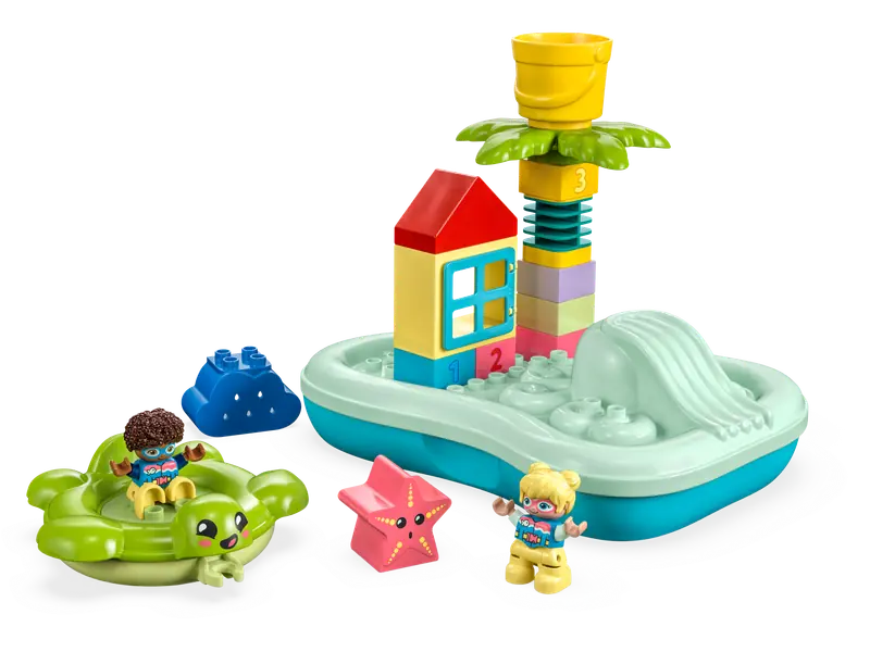 Oto przepisany tekst: Poszukujesz zabawki do kąpieli dla dzieci w wieku od dwóch lat? Zestaw LEGO DUPLO Town Park wodny (10989) przekształca codzienną kąpiel w edukacyjną przygodę, podczas której mali odkrywcy poznają kolorowy park wodny. Ta zabawka nie tylko wprowadza dzieci w świat liczb i rozwija umiejętność nalewania, ale jest również łatwa do czyszczenia i przechowywania. Interaktywna zabawa rozwijająca kreatywność Ta edukacyjna zabawka zawiera elastyczną palmę, której wysokość dzieci mogą zwiększać, dokładając do niej klocki z cyframi. Mogą też napełnić wiadro na drzewie wodą, aby ochlapać figurkę dziecka. Mogą zjechać figurką po zjeżdżalni i posadzić ją na nadmuchiwanym żółwiu. Wypełniając chmurę wodą, sprawią, że na wszystkie elementy spadnie deszcz. Praktyczna konstrukcja, którą docenią również rodzice Zabawki do kąpieli LEGO DUPLO zostały zaprojektowane tak, aby dorośli mogli uczestniczyć w radosnej zabawie dzieci. Po zakończeniu kąpieli pływające koło otwiera się, umożliwiając łatwe wysuszenie i utrzymanie higieny zabawki. Edukacyjna zabawka do kąpieli dla dzieci - baw się podczas kąpieli z zabawkowym parkiem wodnym (10989). Kreatywny zestaw dla maluchów w wieku od dwóch lat rozwija umiejętność rozpoznawania liczb i koordynację wzrokowo-ruchową. Ciekawa zabawka do zbudowania w wannie - ta zabawka do kąpieli zawiera pływającą wyspę i koło z żółwiem, elastyczną palmę z wiadrem na wodę, zjeżdżalnię w kształcie ośmiornicy, dwie figurki dzieci, rozgwiazdę i chmurkę, z której pada deszcz. Zabawka, która rozwija wyobraźnię - podczas kąpieli dzieci rozwijają umiejętności i uczą się liczb, układając klocki, aby drzewko „rosło”, i towarzysząc figurce podczas odkrywania atrakcji wesołego parku wodnego. Prezent dla przedszkolaków - idealny podarunek dla maluchów w wieku od dwóch lat na urodziny, specjalne okazje i na co dzień. Budowanie podczas kąpieli - ten zestaw ma 22 cm wysokości, 25 cm szerokości i 19 cm głębokości. Należy do serii zabawek do kąpieli LEGO DUPLO (sprzedawanych oddzielnie). Cyfrowe instrukcje budowania - aplikacja LEGO Builder zawiera cyfrową wersję instrukcji do zestawu. Nauka poprzez zabawę - zestawy LEGO DUPLO zostały fachowo zaprojektowane, aby pomóc maluchom osiągać kolejne etapy w rozwoju i rozwijać wyobraźnię podczas kreatywnej zabawy. Jednolita jakość - zestawy LEGO DUPLO spełniają surowe branżowe standardy. Dzięki temu maluchy mogą z łatwością chwycić, złączyć i rozłączyć klocki - i tak jest niezmiennie od 1969 roku. Gwarancja bezpieczeństwa - klocki i elementy LEGO DUPLO są badane i testowane na wszelkie możliwe sposoby, aby można było mieć pewność, że spełniają rygorystyczne światowe standardy bezpieczeństwa.