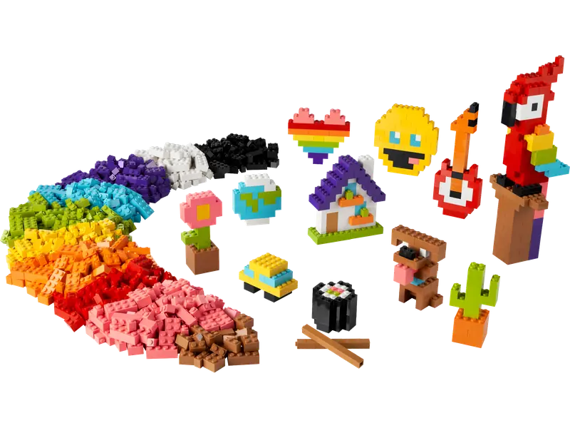Zestaw zawiera 1000 klocków LEGO w intensywnych barwach, w tym popularny klocek 2x4. Dołączone są czytelne, drukowane instrukcje do budowania różnych modeli, takich jak samochód, globus, kwiat, serce, gitara, dom, emoji, papuga, pies i jabłko. Zestaw zachęca do swobodnej, twórczej zabawy i zawiera broszurę z instrukcjami oraz sugestiami dla młodych konstruktorów. Cyfrowe instrukcje dostępne są również w aplikacji LEGO Builder.