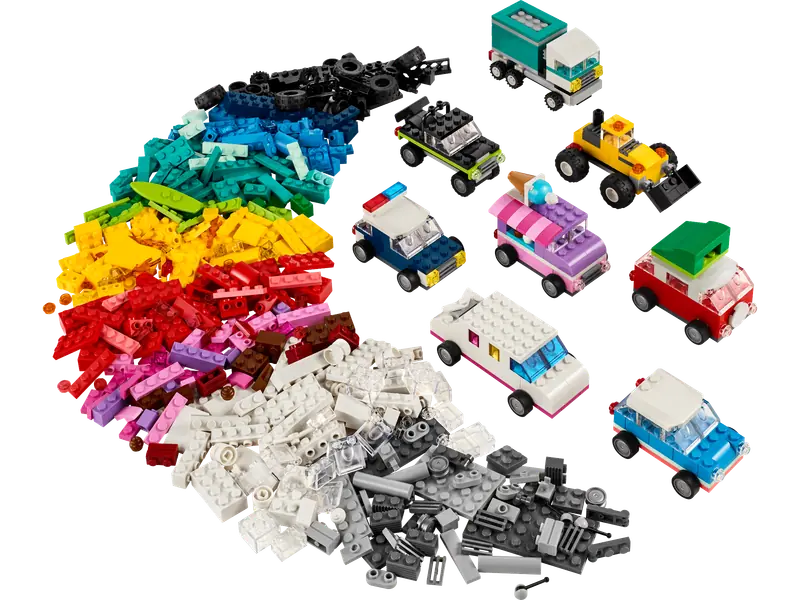 Pobudzaj kreatywność młodych budowniczych od 5. roku życia z kolorowym zestawem LEGO Classic Kreatywne pojazdy. Podaruj chłopcom i dziewczynkom zabawkę konstrukcyjną, która łączy naukę z zabawą. Pozwól dzieciom budować różnorodne pojazdy: radiowóz, furgonetkę z lodami, quada, koparkę, ciężarówkę, samochód kombi, terenówkę i limuzynę.
