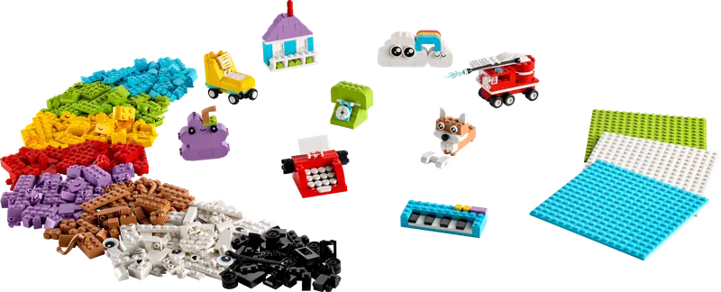 Dzięki 750 kolorowym klockom, trzem płytkom 16x16, elementom z oczami, kołom, oknom i dodatkowym częściom specjalnym dzieci mogą budować dowolne konstrukcje. Proste instrukcje pomogą im stworzyć proste modele, takie jak dom, pies z kością, wóz strażacki z ruchomą drabiną, keyboard, telefon, maszyna do pisania, winogrono, chmury z tęczą i wrotka.