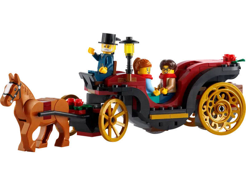 Odkryj magię świąt z zestawem LEGO Świąteczna przejażdżka powozem (40603). Zbuduj obrotowy powóz o bordowym wnętrzu, złotych kołach i tylnym bagażniku, a następnie wyrusz w podróż z minifigurkami woźnicy i dwóch pasażerów oraz figurką konia. Ten uroczy model, mierzący 9 cm wysokości, 24 cm długości i 6 cm szerokości, stanie się wyjątkową ozdobą każdej świątecznej kolekcji LEGO i z pewnością zachwyci miłośników klocków w każdym wieku.