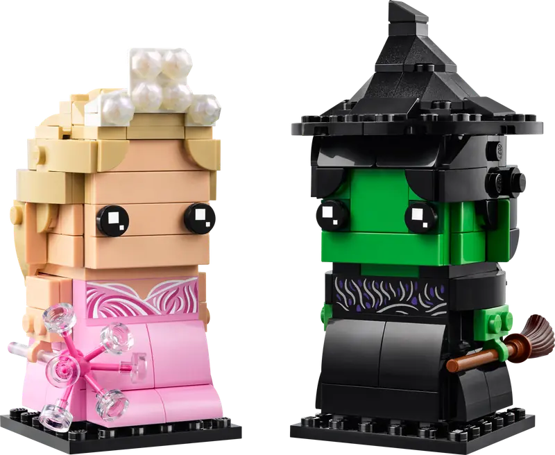 - Szczegółowe wizerunki - modele BrickHeadz przedstawiają Elphabę Thropp i Glindę Upland w ich charakterystycznych strojach, z diademem i różdżką