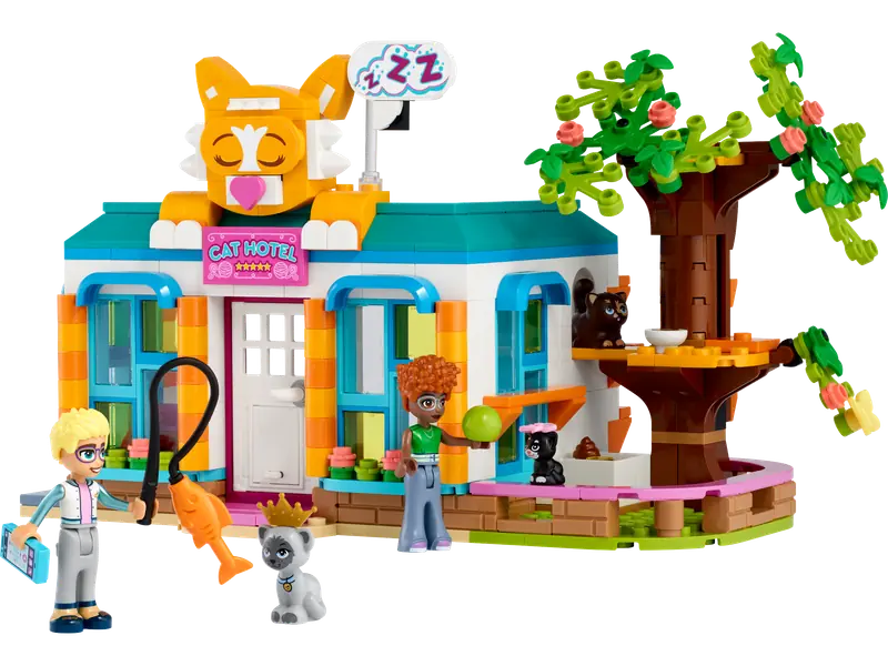 Zestaw LEGO Friends Koci hotel (41742) to idealna propozycja dla dzieci, które kochają koty. Przeznaczony dla sześciolatków i starszych, zestaw oferuje mnóstwo możliwości kreatywnej zabawy, zawierając dwie minilaleczki i trzy figurki kotów. Dzieci mogą wcielić się w rolę Olly’ego, który przywozi swojego kota do hotelu wyposażonego w trzy pokoje, sofy i drapak. Olly przygotował nawet kokardy i koronę dla swoich pupili. Na zewnątrz znajduje się koci znak, drzewko oraz drzwi dla ludzi i mniejsze drzwi dla kotów, co dodatkowo urozmaica zabawę. W zestawie znajdują się także akcesoria, takie jak kuweta, karma dla kotów i zabawki, umożliwiające dzieciom odgrywanie scenariuszy związanych z opieką nad zwierzętami.