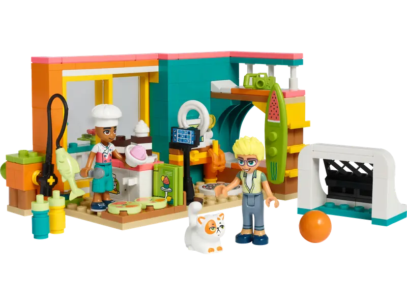 Zestaw LEGO Friends Pokój Leo (41754) oferuje dzieciom w wieku od sześciu lat bogactwo funkcji związanych z pieczeniem ciast i kreatywnymi aktywnościami. Leo urządził swoje pomieszczenie jako studio nagrań, by tworzyć filmy na swój kanał kulinarny. Dzieci z radością dołączą do Leo i Olly’ego – eksperta od filmowania. Zestaw zawiera liczne elementy zachęcające do odgrywania ról, takie jak zabawka dla kota, książka kucharska czy kamera. Po zakończeniu nagrań można otworzyć drzwi na balkon, by podziwiać widok na morze z tej plażowej sypialni.