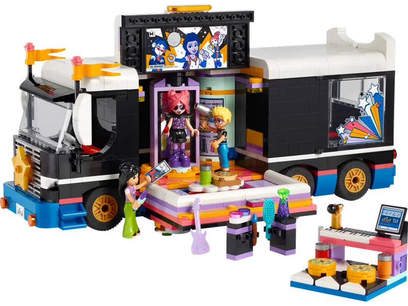 - Zestaw muzyczny z autobusem - LEGO Friends Autobus koncertowy gwiazdy popu dla dzieci od 8 lat, zawierający cztery minilaleczki i liczne akcesoria