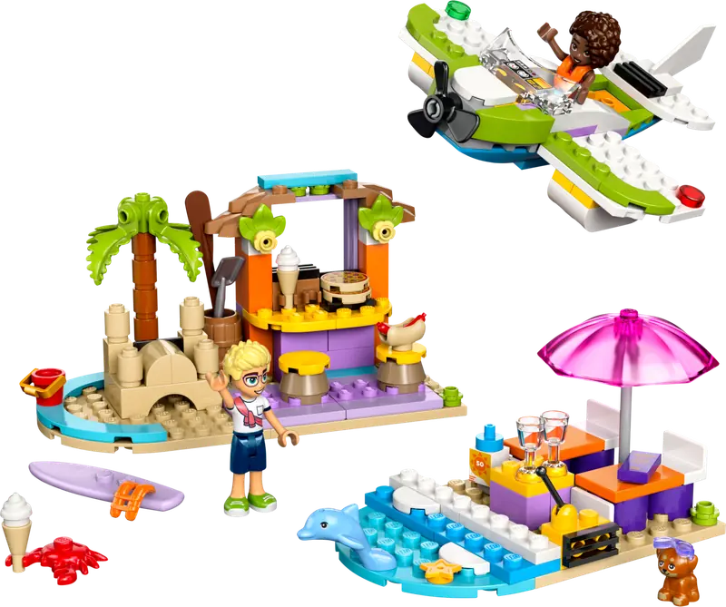 W zestawie znajdują się: wodnosamolot z obracającym się śmigłem, strefa relaksu z deską surfingową i kawiarnia plażowa z zamkami z piasku, siedziskami oraz lodami. Modele można przekształcić w zabawkową motorówkę, strefę wypoczynkową na świeżym powietrzu i pizzerię z piecem do pizzy. Dodatkowo zestaw zawiera dwie minilaleczki oraz figurki psa i delfina.