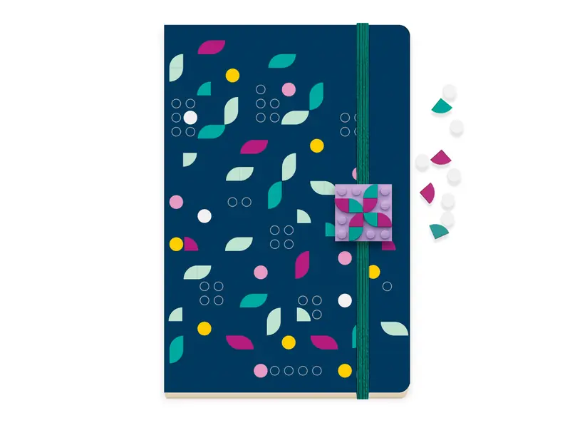 - Elastyczna gumka z ozdobnym elementem 4x4 LEGO zapewnia bezpieczne zamknięcie zeszytu, a sam element można dodatkowo dekorować 18 kolorowymi płytkami DOTS.