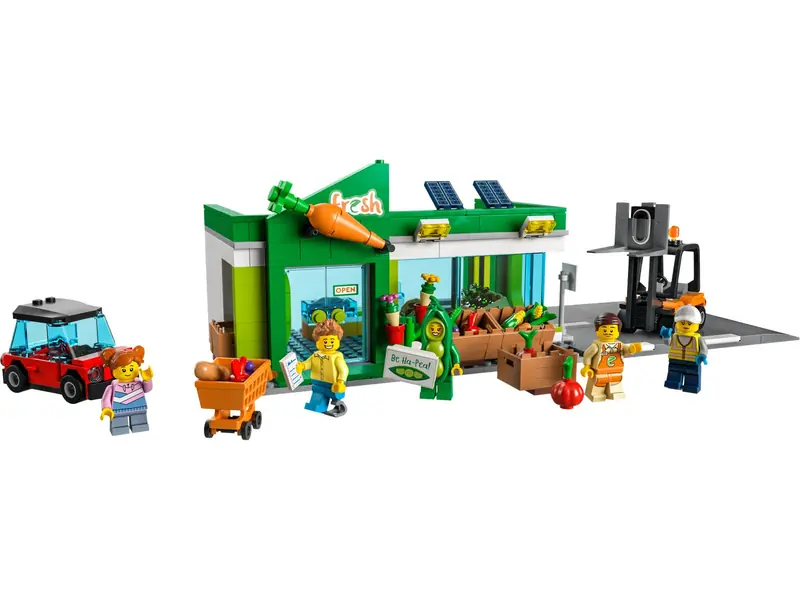 Zestaw LEGO City Sklep spożywczy (60347) oferuje dzieciom nieograniczone możliwości kreatywnej zabawy. W zabawkowym sklepie znajdują się różnorodne produkty, a także samochód elektryczny, wózek widłowy i wózek na zakupy. Model sklepu można łączyć z innymi zestawami LEGO City przy użyciu płyt drogowych, co dodatkowo wzbogaca zabawę. W zestawie znajduje się pięć minifigurek, w tym pan Reklama z serialu LEGO City Adventures.