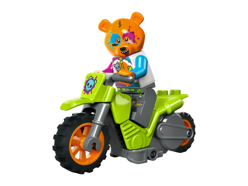 Zestaw LEGO City Motocykl kaskaderski z niedźwiedziem (60356) zapewnia dzieciom w wieku od pięciu lat niekończącą się zabawę. W skład zestawu wchodzi motocykl napędzany kołem zamachowym, idealny do wykonywania spektakularnych skoków i trików. Wystarczy dodać minifigurkę motocyklisty w zabawnym niedźwiedzim kasku, aby rozpocząć pełne emocji pokazy.