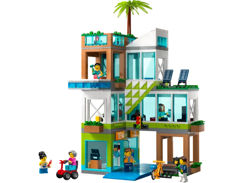 - Zawartość pudełka - W zestawie znajduje się apartamentowiec z panelami słonecznymi, sklep spożywczy, salon, kuchnia, sypialnia i łazienka, a także rower, skuter inwalidzki i sześć minifigurek.