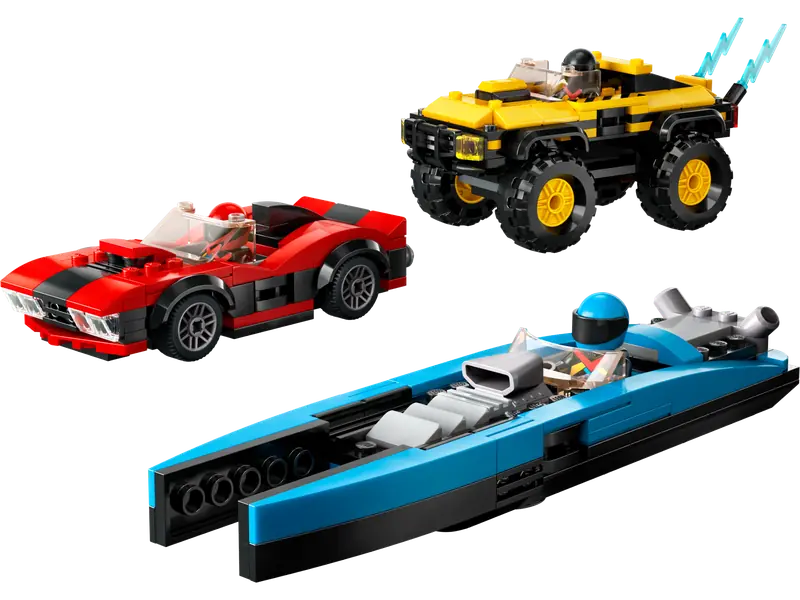 - Zawartość pudełka - wszystkie elementy potrzebne do zbudowania czerwonego samochodu sportowego, żółtego SUV-a i niebieskiej motorówki, a także trzy minifigurki kierowców