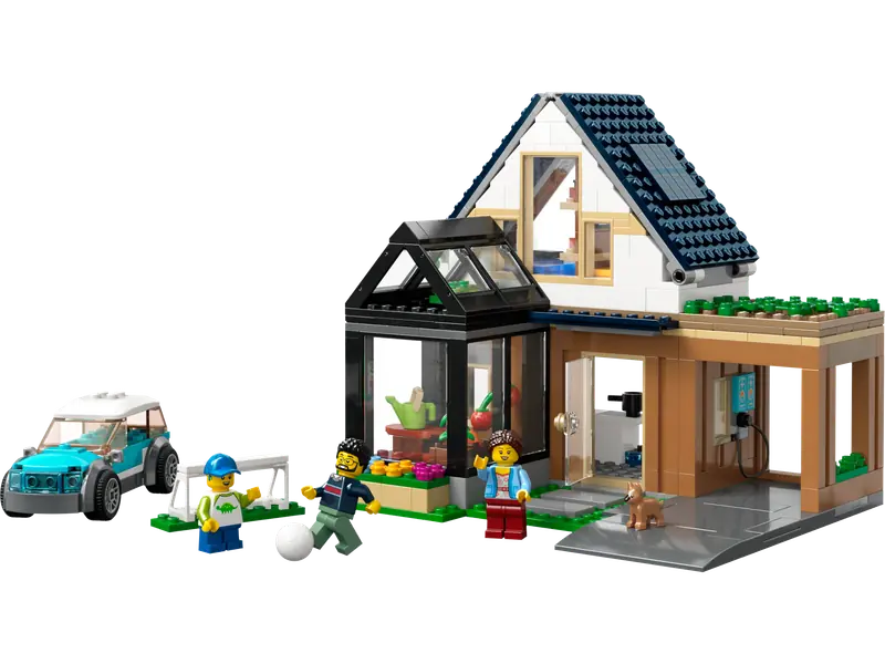 Zestaw LEGO City Dom rodzinny i samochód elektryczny (60398) dla dzieci od szóstego roku życia zawiera modułowe segmenty, które można dowolnie łączyć, w tym oranżerię z jadalnią, kuchnię, dwie sypialnie i łazienkę. Model domu wyposażony jest w stację ładowania pojazdu elektrycznego oraz panele słoneczne, a także płytę drogową LEGO kompatybilną z innymi zestawami z serii LEGO City. W zestawie znajdują się trzy minifigurki i figurka szczeniaka, co pozwala na długie godziny kreatywnej zabawy.