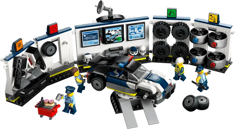 - Policyjny warsztat tuningowy LEGO City – zestaw dla dzieci od sześciu lat, oferujący akcję policyjną na zróżnicowanym terenie