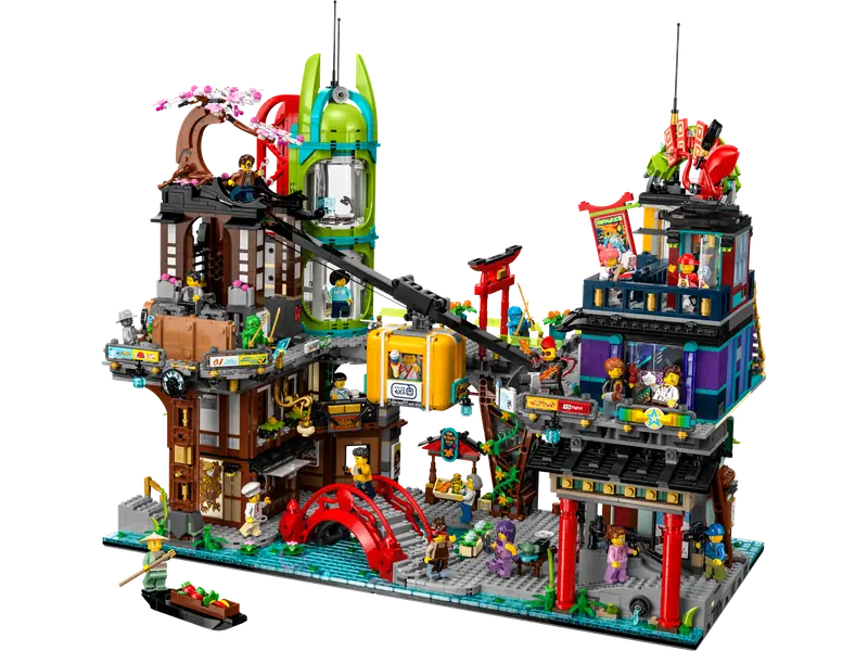 Zestaw do budowania Rynek miejski NINJAGO (71799) umożliwia dzieciom od 14 lat oraz kolekcjonerom LEGO przeżycie niezwykłych emocji i odkrycie tętniącego życiem miejsca, gdzie ninja mieszkają i bawią się. Największy w historii model NINJAGO obejmuje cztery piętra wypełnione sklepami, restauracjami, biurami i apartamentami, a także kolejką linową, windą, łodzią, mostem oraz spłukiwaną toaletą.