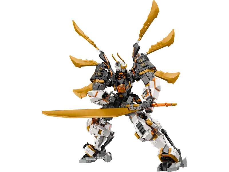 - Ruchomy tytanowy mech - największy mech NINJAGO z ruchomymi kończynami, głową, ciałem i przegubami, umożliwiający ustawianie w różnych pozach