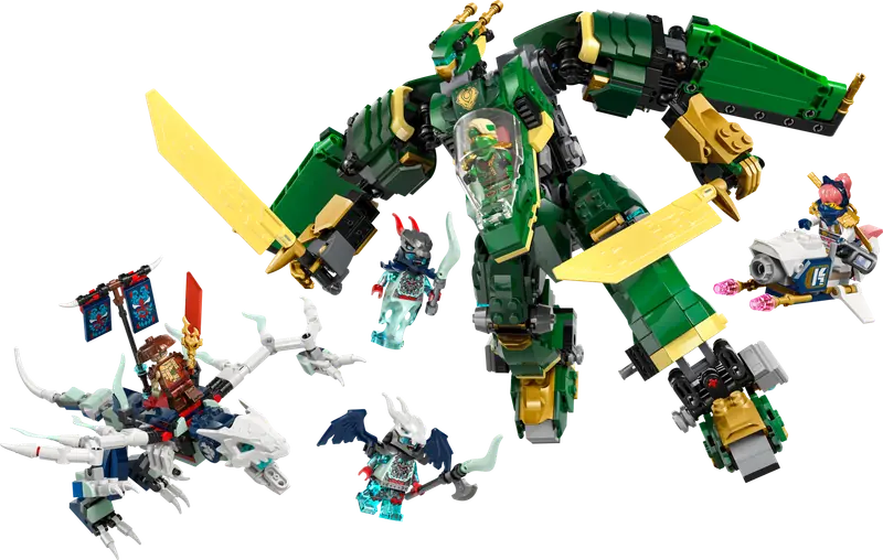 Zestaw konstrukcyjny LEGO NINJAGO Odrzutowy mech Lloyda (71845) umożliwia dzieciom w wieku dziewięciu lat i starszym przeżywanie ekscytujących przygód oraz walk ninja – zarówno w powietrzu, jak i na ziemi – inspirowanych trzecim sezonem serialu NINJAGO Powstanie Smoków.