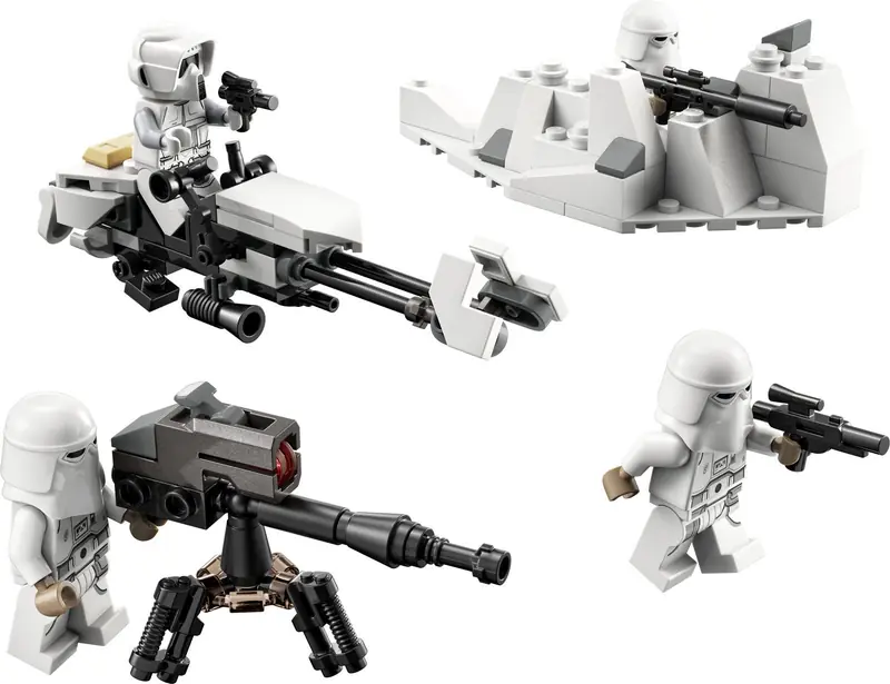 - Miniaturowe modele - Zestaw zawiera ścigacz imperialny z Hoth (który można połączyć z zestawem 75313 AT-AT), ciężki blaster samopowtarzalny E-Web strzelający klockami oraz okop śnieżny z dodatkową amunicją