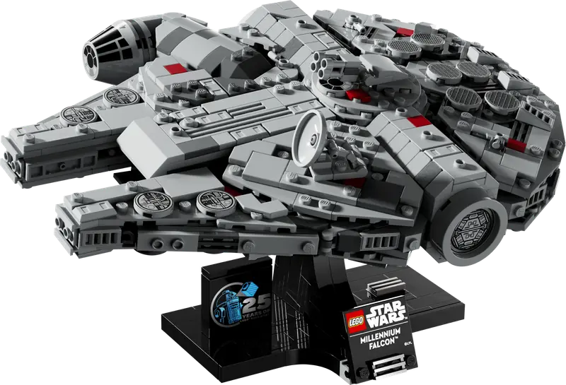 - Idealna dekoracja - podstawka do zbudowania zawiera tabliczkę i klocek z okazji 25. rocznicy LEGO Star Wars. Model zaprojektowano tak, aby eksponować Sokoła Millennium pod dynamicznym kątem