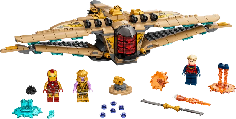 - Statek kosmiczny z klocków posiada otwierany kokpit i ładownię oraz sześć miotaczy klocków. Dzieci mogą pomóc superbohaterom powstrzymać Thanosa przed użyciem Rękawicy Nieskończoności.