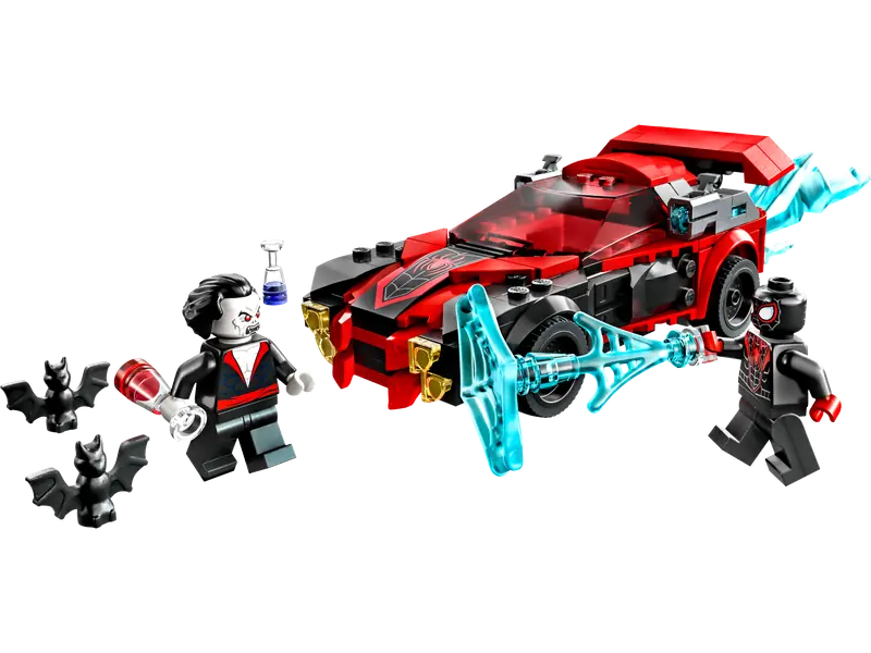 Młodzi fani Marvela pokochają ten dynamiczny zestaw zawierający minifigurki Milesa Moralesa i wampira Morbiusa, wraz z licznymi realistycznymi akcesoriami oraz samochodem wyścigowym. Pojazd wyposażony jest w dwa miotacze klocków i duży dopalacz z tyłu, zapewniający dodatkową moc w razie potrzeby. Miles Morales ma wyrzutnię sieci, a Morbius – parę nietoperzy jako pomocników. Dodatkową rozrywkę oferuje cyfrowa aplikacja LEGO Builder, umożliwiająca powiększanie i obracanie modelu podczas budowania.
