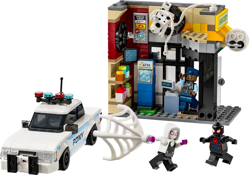 W zestawie znajdują się cztery minifigurki: Milesa Moralesa, Spota, Gwen Stacy i oficera Jeffersona. Budynek sklepu wyposażony jest w funkcję wybuchającej ściany, co pozwala na wyciągnięcie bankomatu. Wśród akcesoriów znajdują się długa, elastyczna lina pajęcza oraz elastyczna pajęczyna, w której można umieścić minifigurkę. Radiowóz policyjny otwiera się, umożliwiając posadzenie w nim dwóch minifigurek. Dodatkową cyfrową rozrywkę zapewnia intuicyjna aplikacja LEGO Builder, w której młodzi konstruktorzy mogą powiększać i obracać modele w trójwymiarze oraz śledzić swoje postępy w budowaniu.
